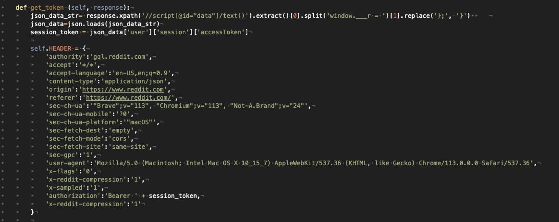 Looking for the string of the token, I found it in the HTML code of the home page of Reddit. Basically, when we visit Reddit’s website, a token is assigned to us for some time and we can use it to read data via the API.