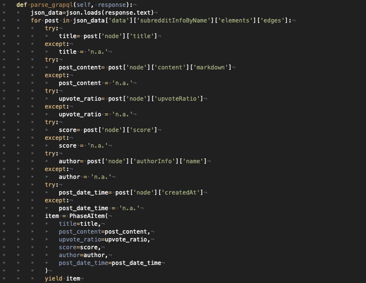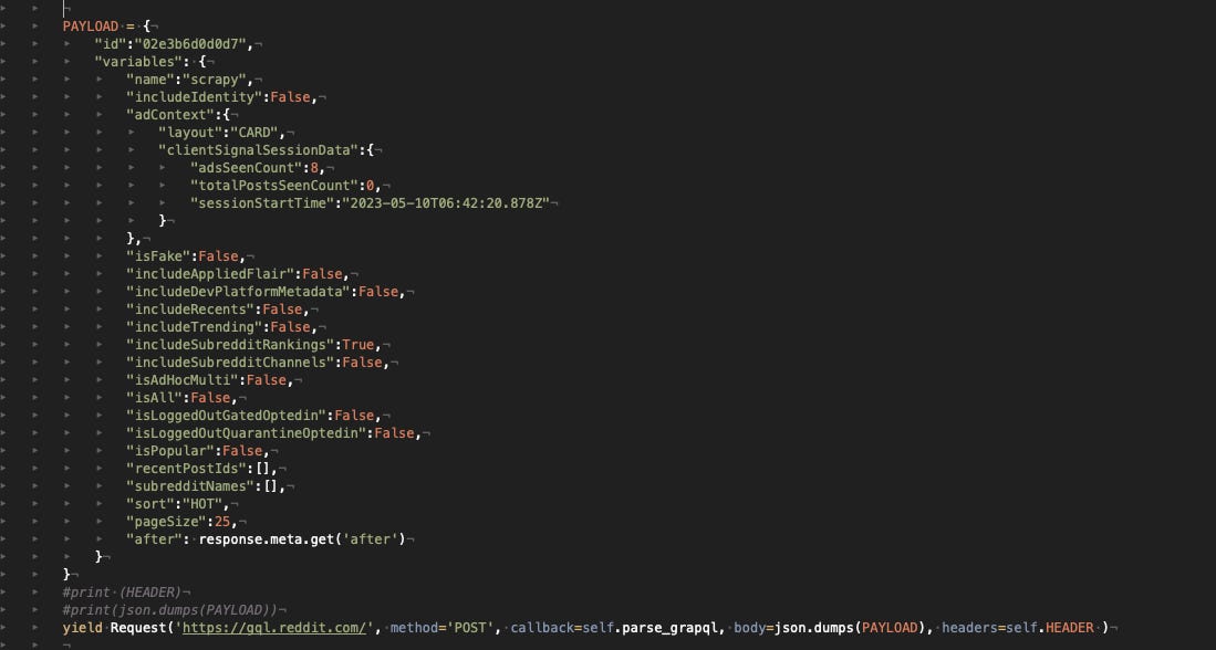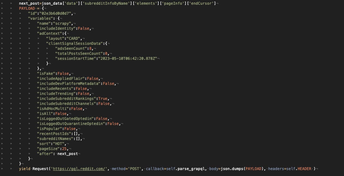 The “id” field identifies the query needed to be executed, while the other fields are all the possible variables. The name field indicates the subreddit to scrape (in this case we’re going to scrape the Scrapy subreddit) while the field “after” is the one we’ll use to paginate the query.