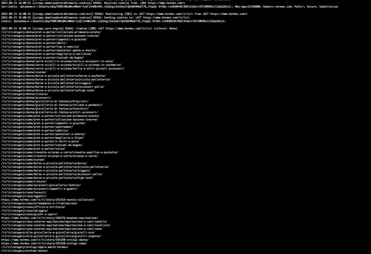I can enter the homepage now and, parsing the JSON in the HTML, I can crawl the whole category tree now! And now in my Cookies, there’s also stored a precious Datadome token, my passe-partout for the website.