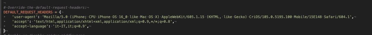 Let’s start with our standard Scrapy spider and see if we can get inside the website, after some make-up to our DEFAULT_REQUEST_HEADERS property.