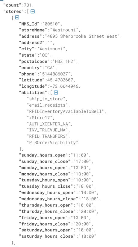 Then we need to get the list of stores, with also the country code to use in the API. Luckily, another APU call is coming to support us.