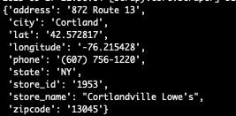 stores=["1709;Bay Shore Lowe's;NY;Bay Shore;800 Sunrise Highway;(631) 954-9001;40.727128;-73.281154", "0523;Utica Lowe's;NY;Utica;710 Horatio Street;(315) 793-3812;43.126065;-75.224919"]