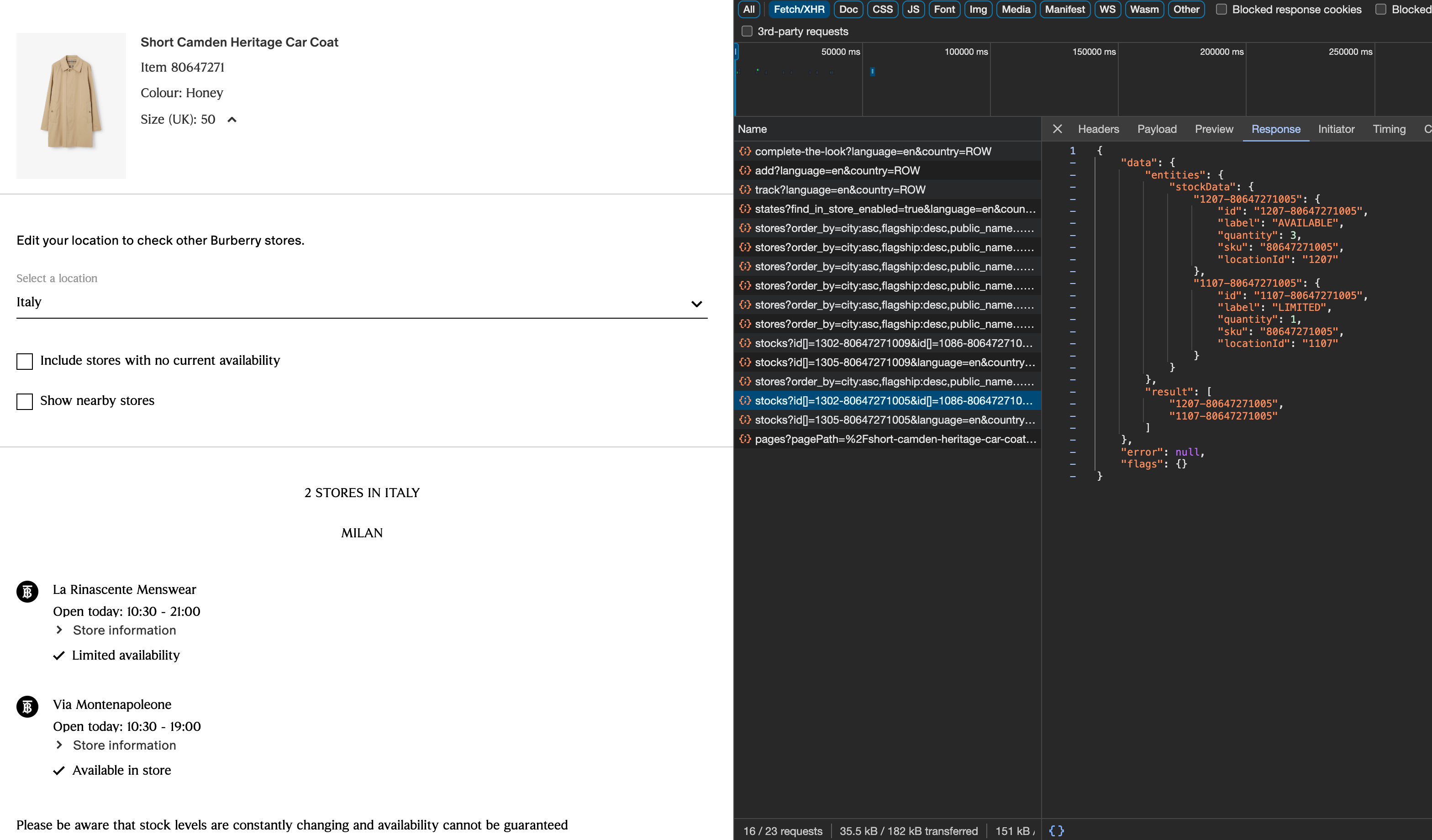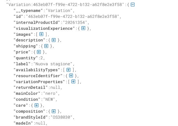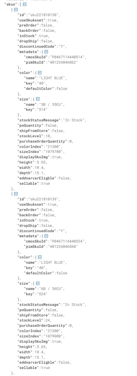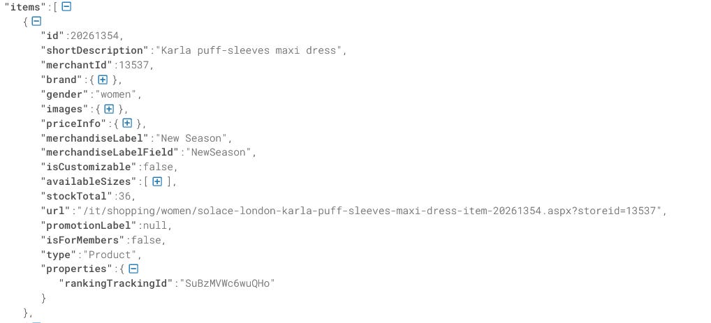 You can see from the JSON that we have the stockTotal field, which is the sum of the stock of every single size of the product. How do I know it? We’re seeing it now.
