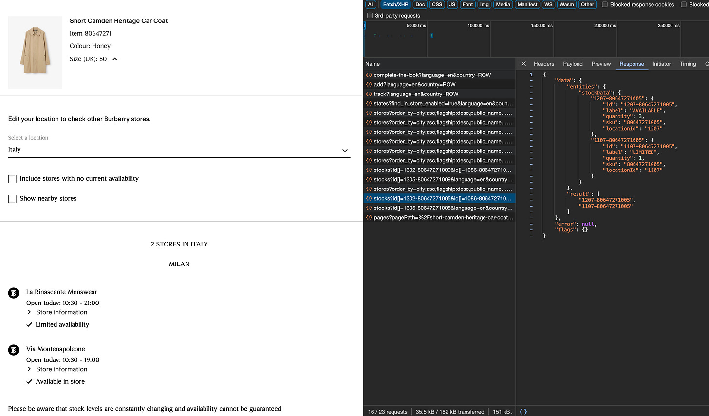 Considering that Burberry has hundreds of stores all over the world and thousands of items on sale, and also that this API needs to be called for each size of these products, you can understand that a simple global snapshot is made by millions of API calls.